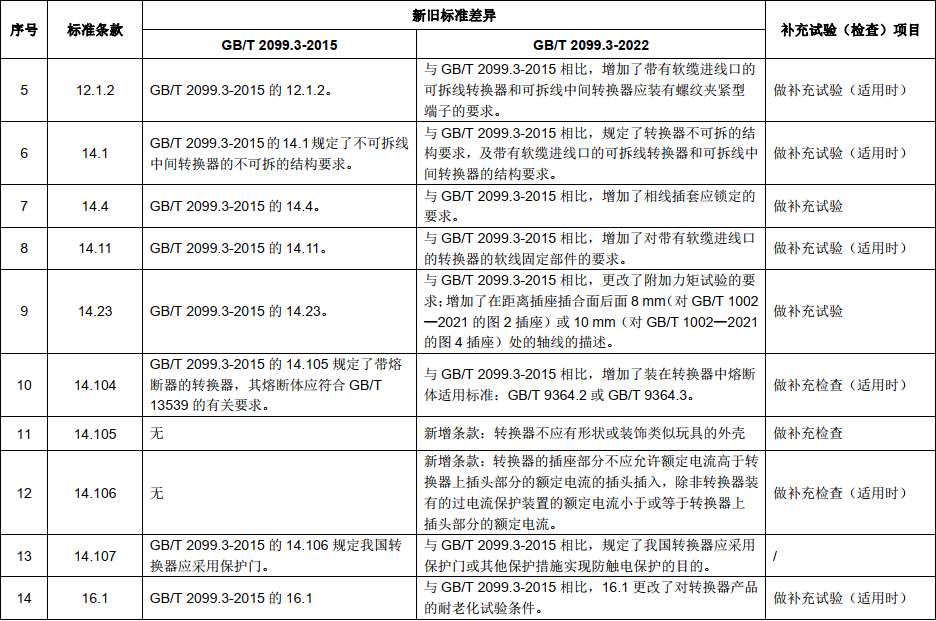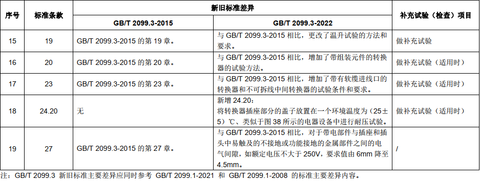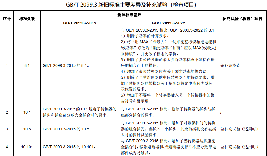 經(jīng)過強(qiáng)制性產(chǎn)品認(rèn)證技術(shù)專家組器具附件組(TC07)對新舊標(biāo)準(zhǔn)的研究分析,表決通過了換版要求。GB/T2099.3一2022標(biāo)準(zhǔn)與GB/T2099.3-2015標(biāo)準(zhǔn)的主要差異及補(bǔ)充試驗(yàn)(檢查項(xiàng)目)如下。