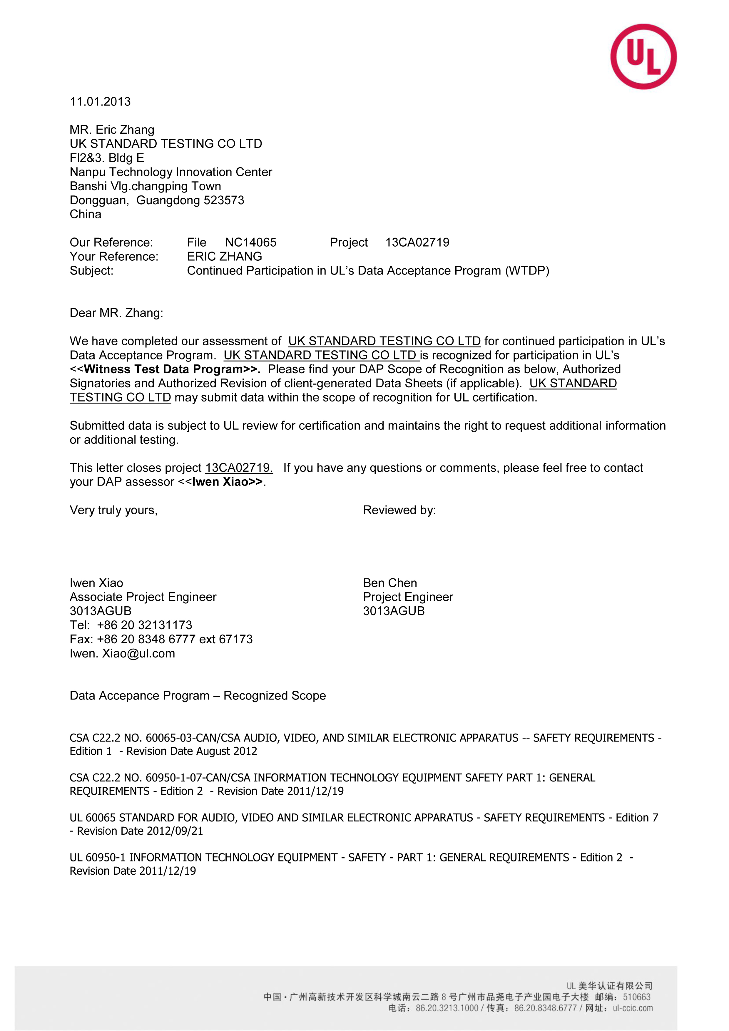2013年1月,優(yōu)科實(shí)驗(yàn)室獲得UL美華認(rèn)證公司授予的ITE/AV UL60065目擊實(shí)驗(yàn)室資格。